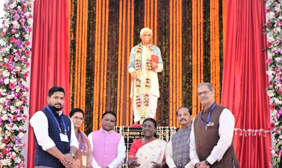 President Smt Droupadi Murmu unveiling the statue of Pandit Raghunath Murmu at Niladri Vihar, Bhubaneswar on 3 December 2024.