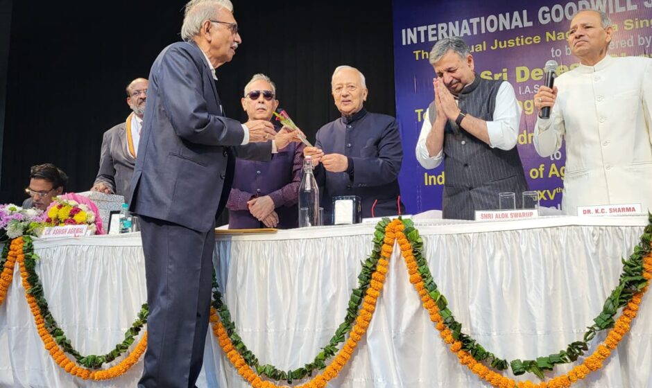 In New Delhi: Veteran Journalist Gopal Misra being received at the International Goodwill Society of India, established by Dr. Nagendra Singh, who had also served as Chief Justice in the International Court of Justice.